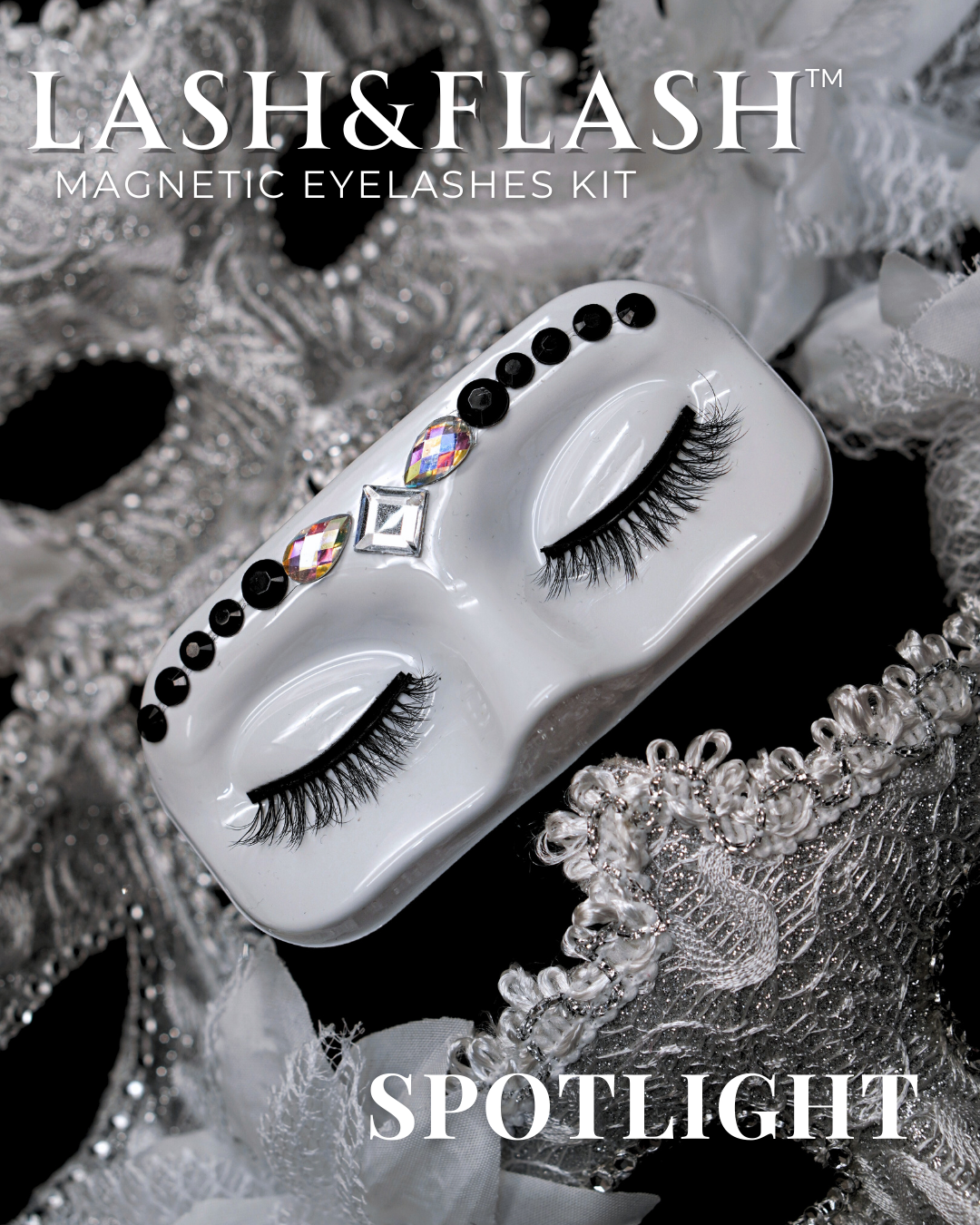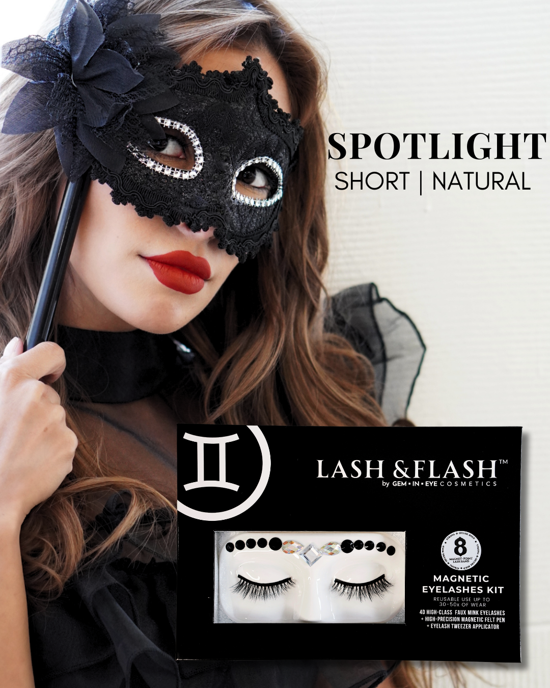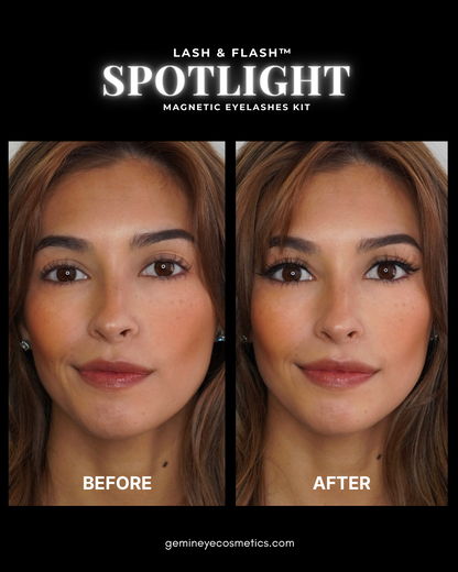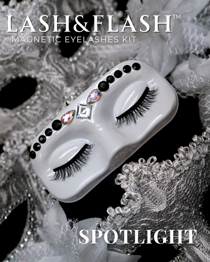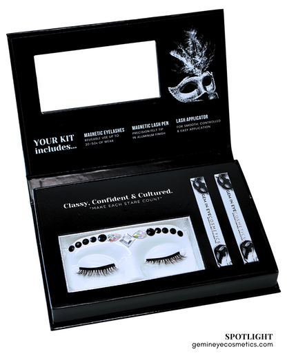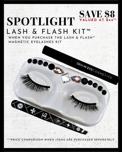 GEM IN EYE Cosmetics Lash &amp; Flash™ Magnetic Eyelashes kit has a pair of classy magnetic eyelashes in a face tray adorned with gems. This kit comes complete package with a smudge-free, waterproof, and latex-free magnetic eyeliner in an aluminum bottle in a matte finish. It has a stainless ball inside that keeps the magnetic eyeliner fresh and long-lasting. Completing the set is an angled lash applicator for precision and hassle-free application.