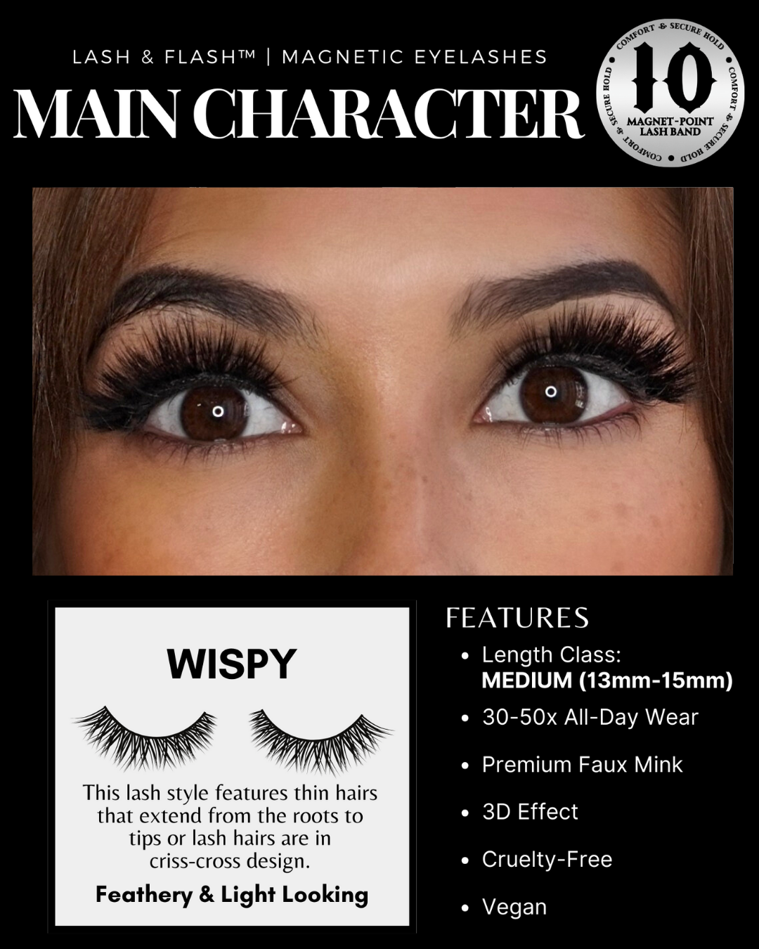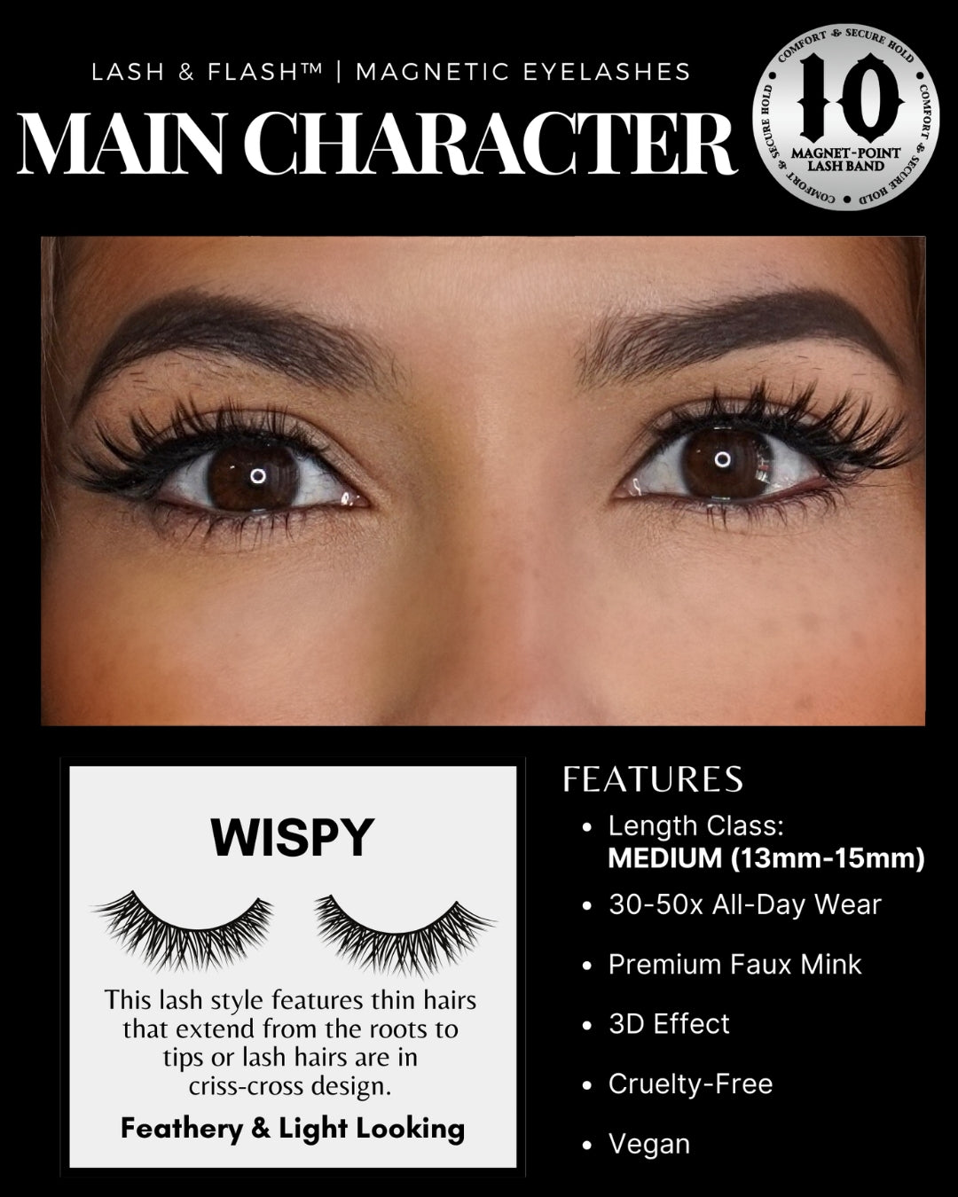 MAIN CHARACTER falls into the WISPY lash style category, producing a delicate and airy appearance that is gentle on the eyes. With a medium length of 13-15mm, it is a suitable choice for everyday use.