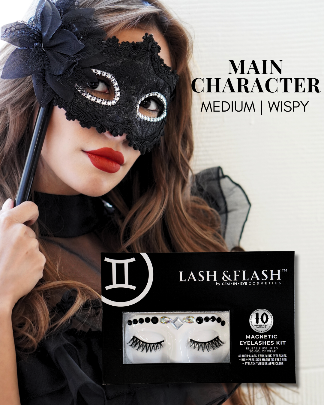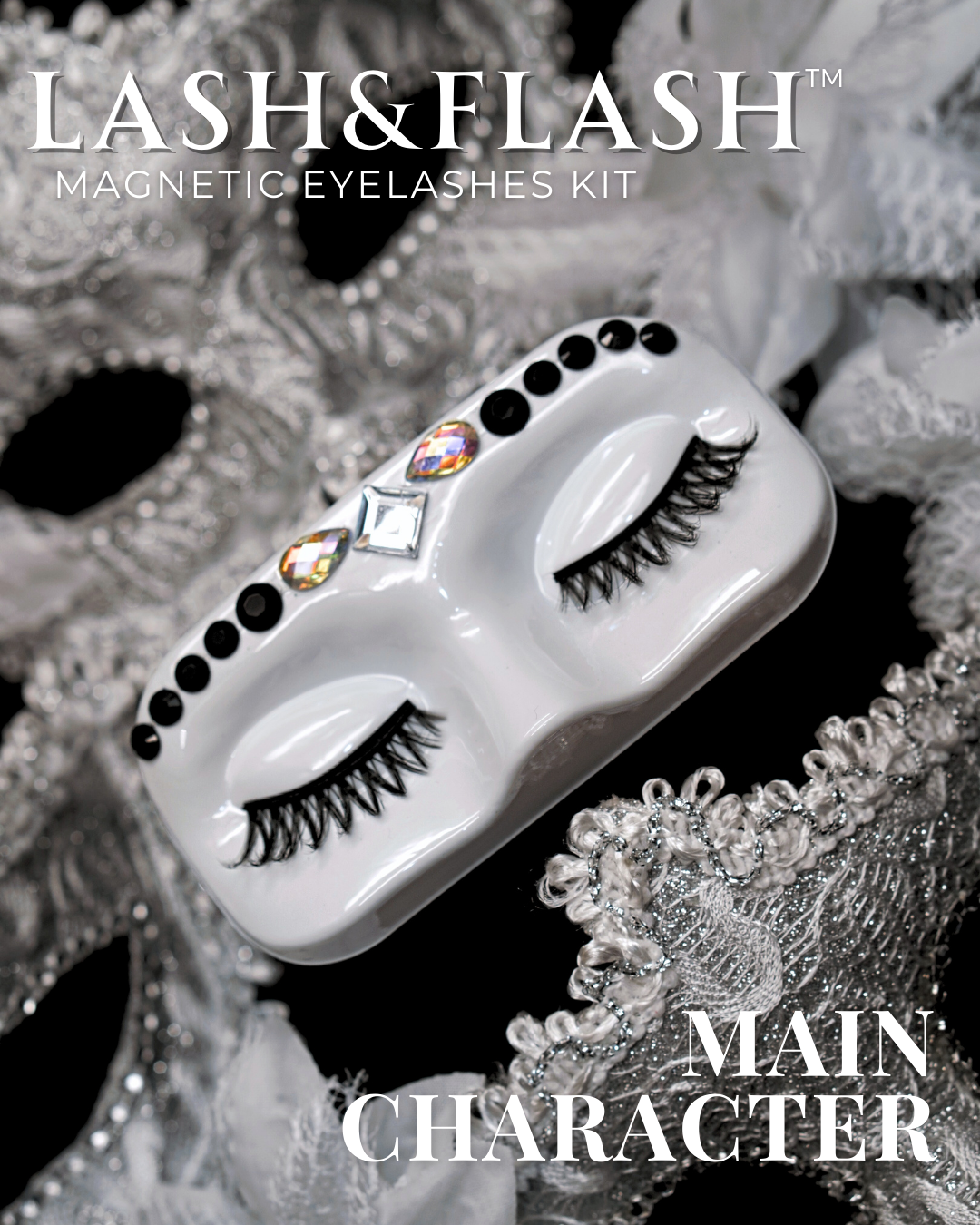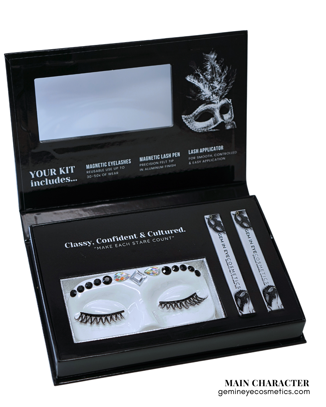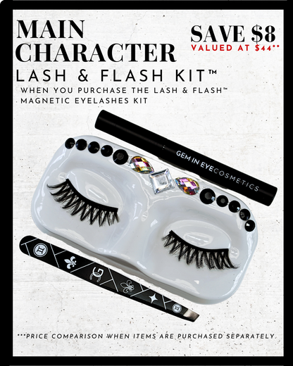 GEM IN EYE Cosmetics Lash &amp; Flash™ Magnetic Eyelashes kit has a pair of classy magnetic eyelashes in a face tray adorned with gems. This kit comes complete package with a smudge-free, waterproof, and latex-free magnetic eyeliner in an aluminum bottle in a matte finish. It has a stainless ball inside that keeps the magnetic eyeliner fresh and long-lasting. Completing the set is an angled lash applicator for precision and hassle-free application.